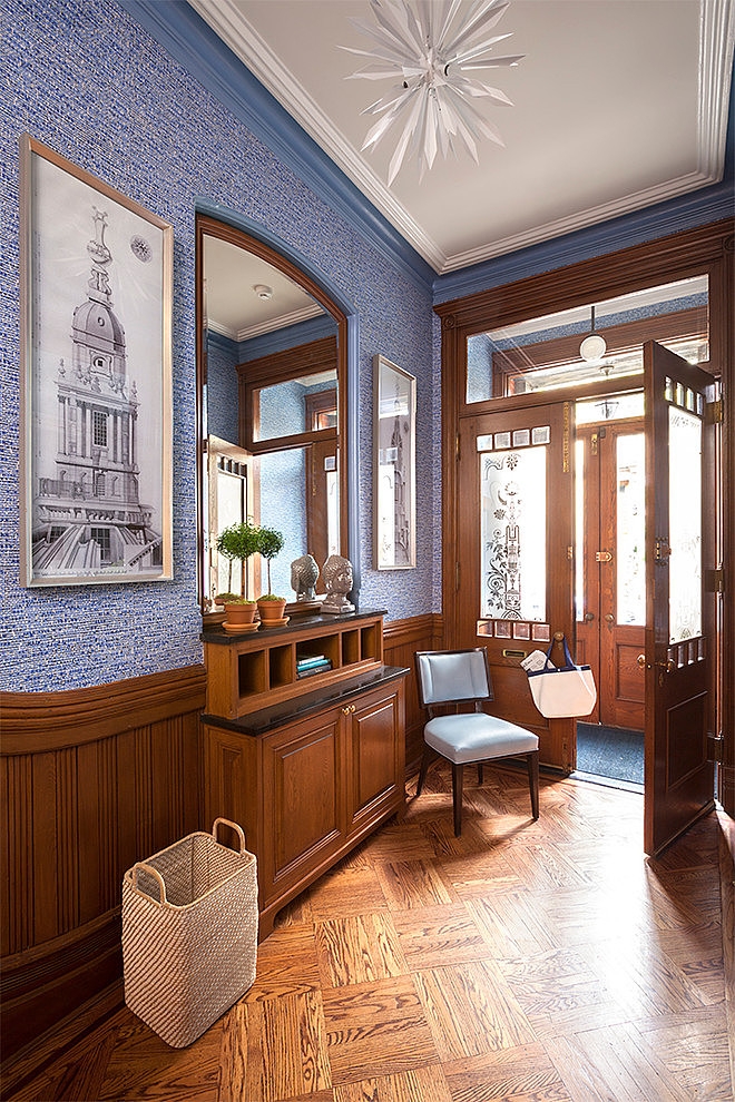 Loving this entry foyer in a 100 year old Brooklyn Heights townhouse. All the traditional stained Victorian woodwork is brought up to date by the modern light fixture and bright blue wallpaper. My favorite part is the recessed credenza (great space for dropping mail and keys, and charging the phones!) and large mirror above. Plus a place to sit and take off your shoes, and a basket to recycle your junk mail right away...